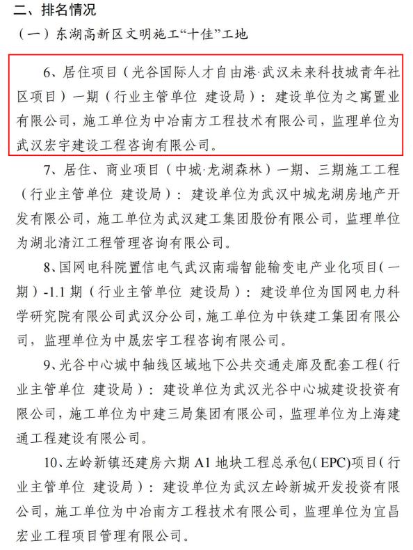 ? 根據(jù)東湖新技術(shù)開發(fā)區(qū)建設(shè)工地文明施工管理工作專班辦公室組織開展的區(qū)內(nèi)建設(shè)工地文明施工專項考評,之寓未來(武漢未來科技城青年社區(qū))項目被評為2021年7月東湖高新區(qū)文明施工“十佳”工地。