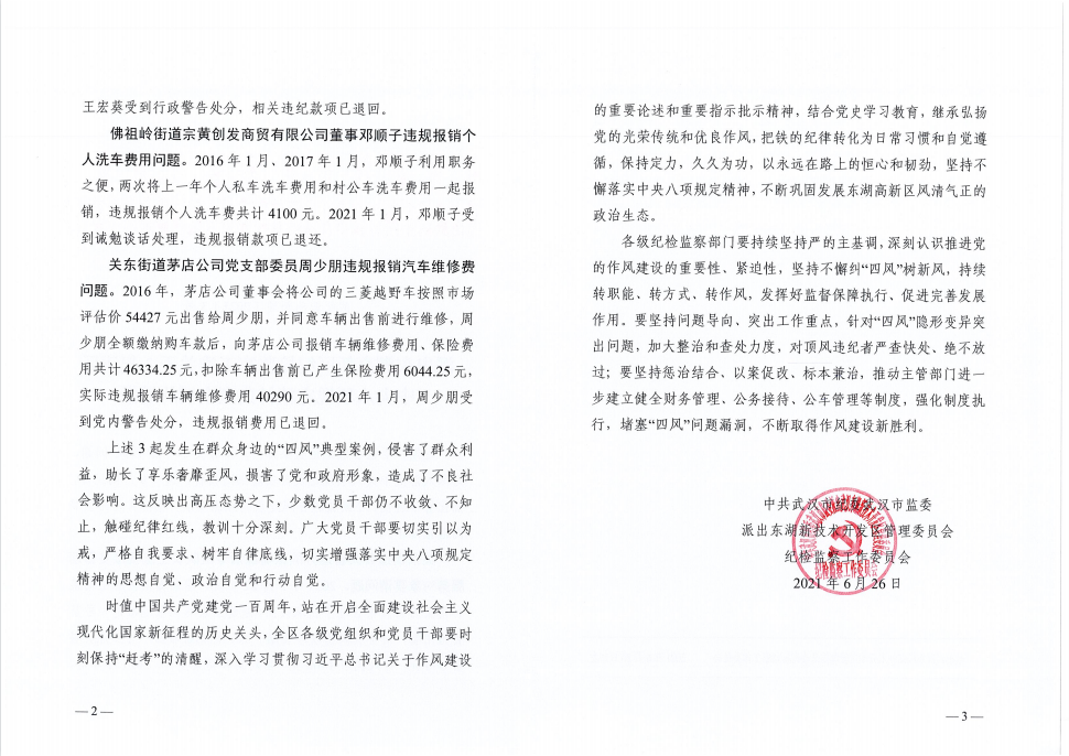 派出東湖高新區紀檢監察工委關于3起違反中央八項規定精神典型案例的通報