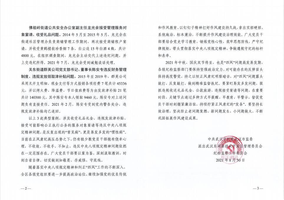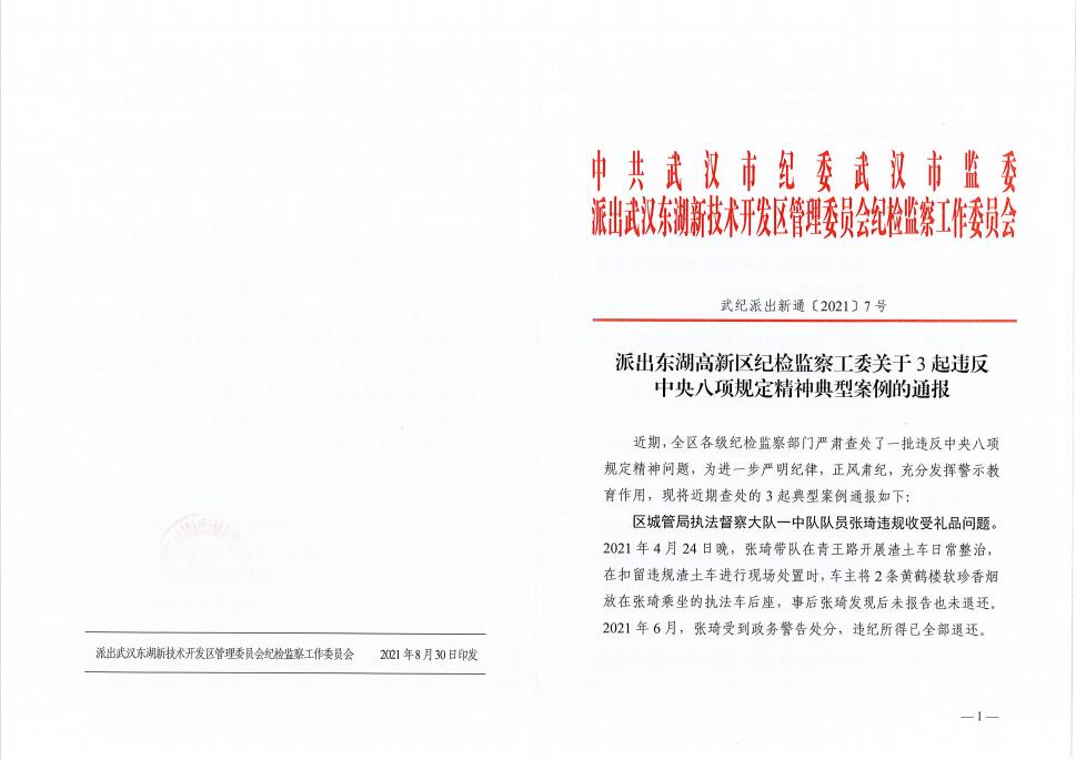 派出東湖高新區(qū)紀檢監(jiān)察工委關(guān)于3起違反中央八項規(guī)定精神典型案例的通報